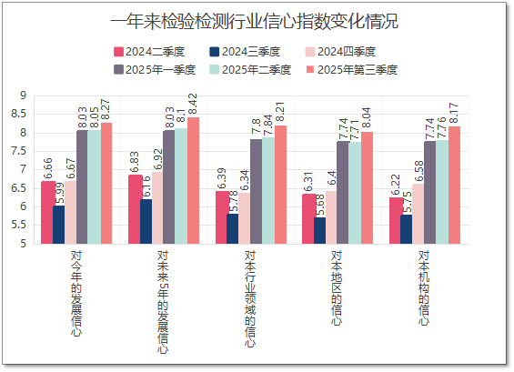 从“对当年行业发展信心”指标来看,去年同期我们首次开展信心指数采集时正值2024年二季度末,从业者们受到去年初以来经济持续低迷、检验检测业务下滑严重等情况的影响,信心数据打出了6.66分的相对低分,信心不足的状况十分显著。经过这一年的发展,到了2025年第3季度末,信心数据提升到8.27分,提升了1.61分,业界的发展信心呈现较为乐观的状态。