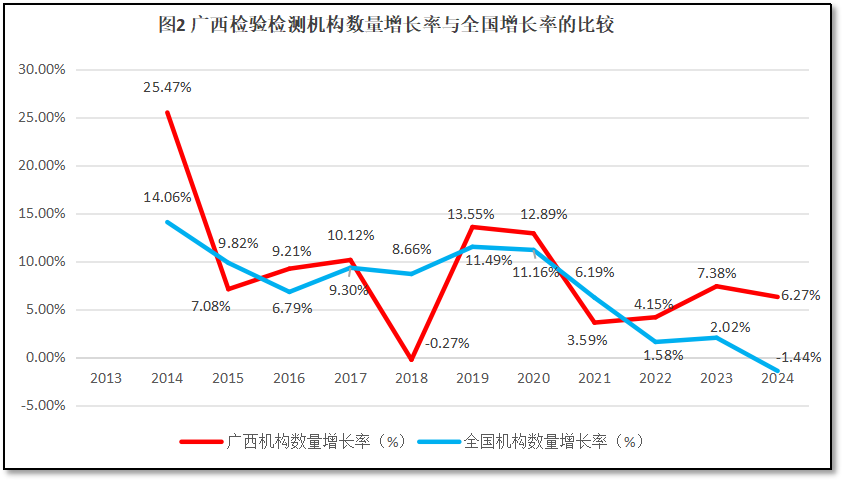 云南省检验检测机构数量增长率与全国检验检测机构数量的增长率进行比较,如图2所示。