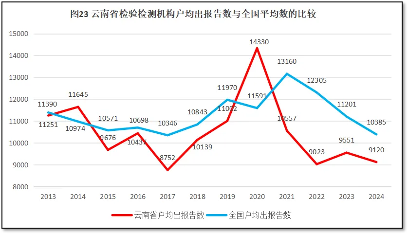 由图23可见,除了2014年和2020年云南省检验检测机构户均出报告数量高于全国平均数之外,其他年份云南省检验检测机构户均出具的报告一直低于全国平均数。最近五年,云南省检验检测机构户均出具报告数量总体呈现不断下降的趋势,2023年度虽有反弹,但2024年度又再次下降。